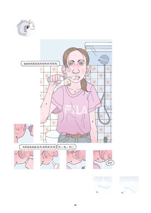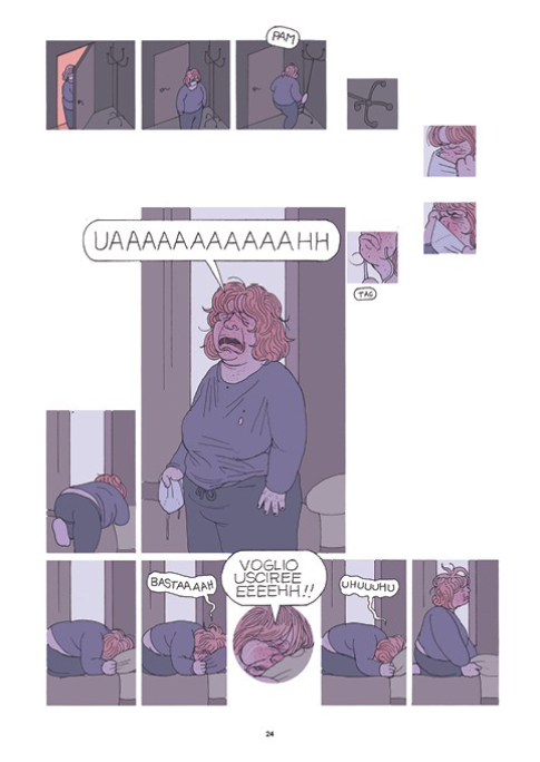 2) Vila hanteert voor een bepaalde, overduidelijk door Chris Ware geïnspireerde pagina-indeling met grote en kleine plaatjes, bijna microscopisch klein, waarin acties en situaties worden opgesplitst in details. Vanwege mijn gestaag verslechterende zicht, verergerd nog door mijn kleurenblindheid, kon ik complete sequenties niet volgen, vooral niet als Vila met verschillende tinten van paars en groen werkt, waardoor voor mij alles één vlek wordt. Dat maakt Comfortless door de vorm alleen al ontoegankelijk voor iemand als ik.