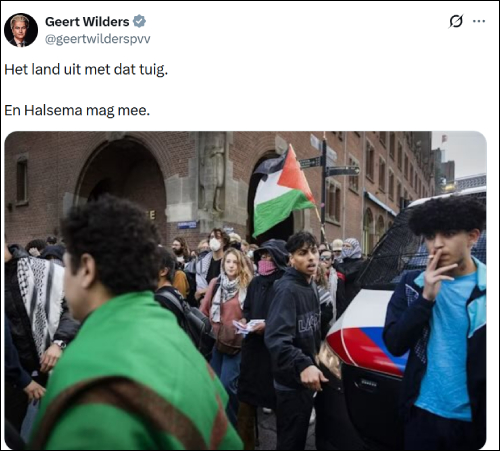 We zien een foto van vreedzaam protesterende activisten met een Palestijnse vlag en daarboven foetert Wilders in twee klunzig onder elkaar geplaatste regels, twee witregels ertussen, dat vreedzame activisten die tegen het vermassamoorden van Palestijnen demonstreren ’tuig’ is dat het land uit moet, met als nagedachte dat de democratisch (jawel, lees gewoon een boekje over staatsinrichting) gekozen bestuurder ook het land uit moet, kennelijk omdat zij het zomaar toelaat dat er in haar stad gebruik wordt gemaakt van het grondwettelijke recht op demonstreren.